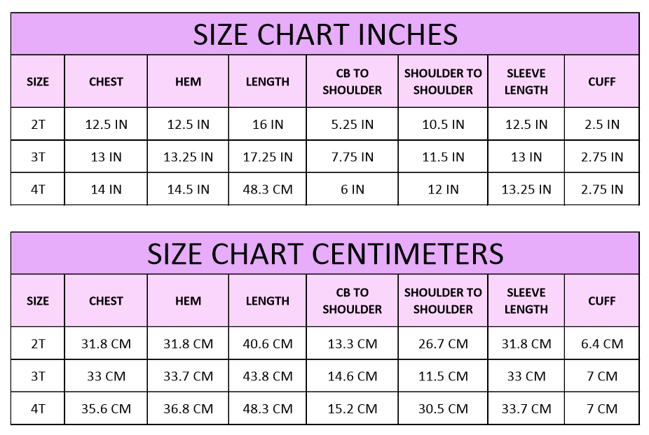 Sizing - Toddler sizes 2T, 3T, & 4T
