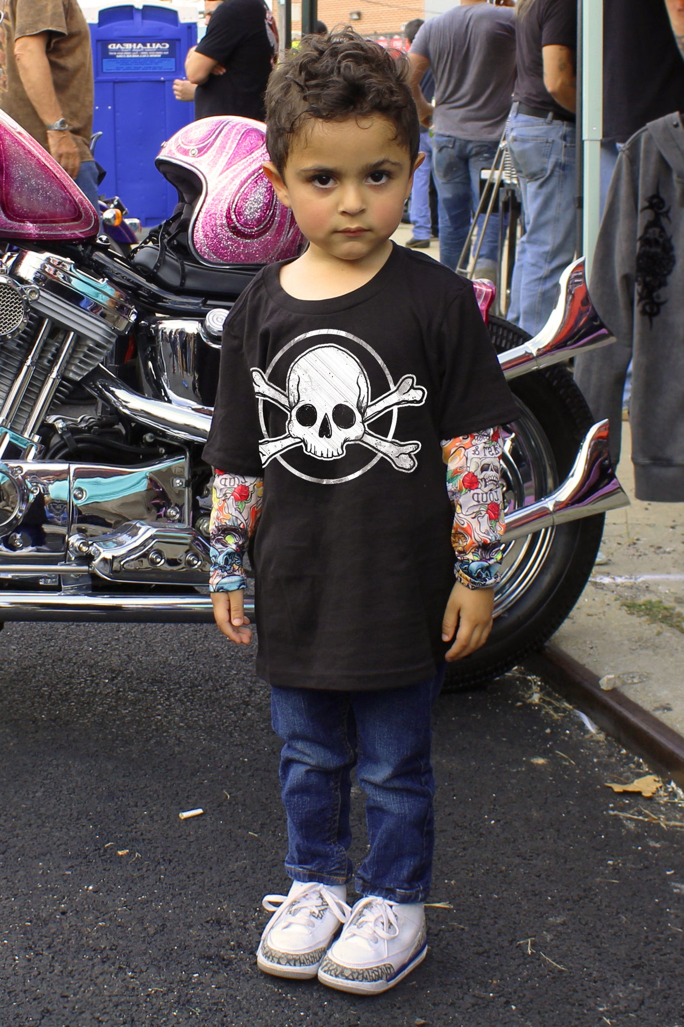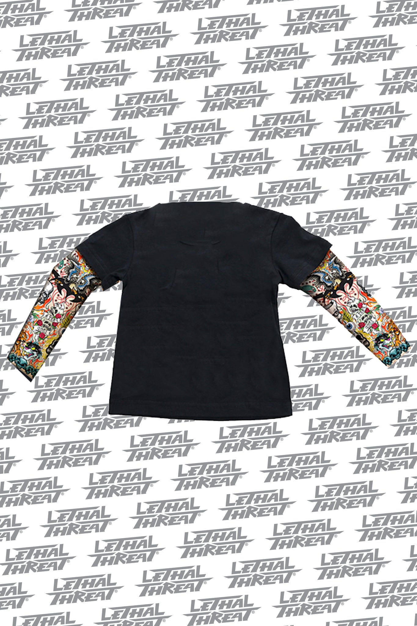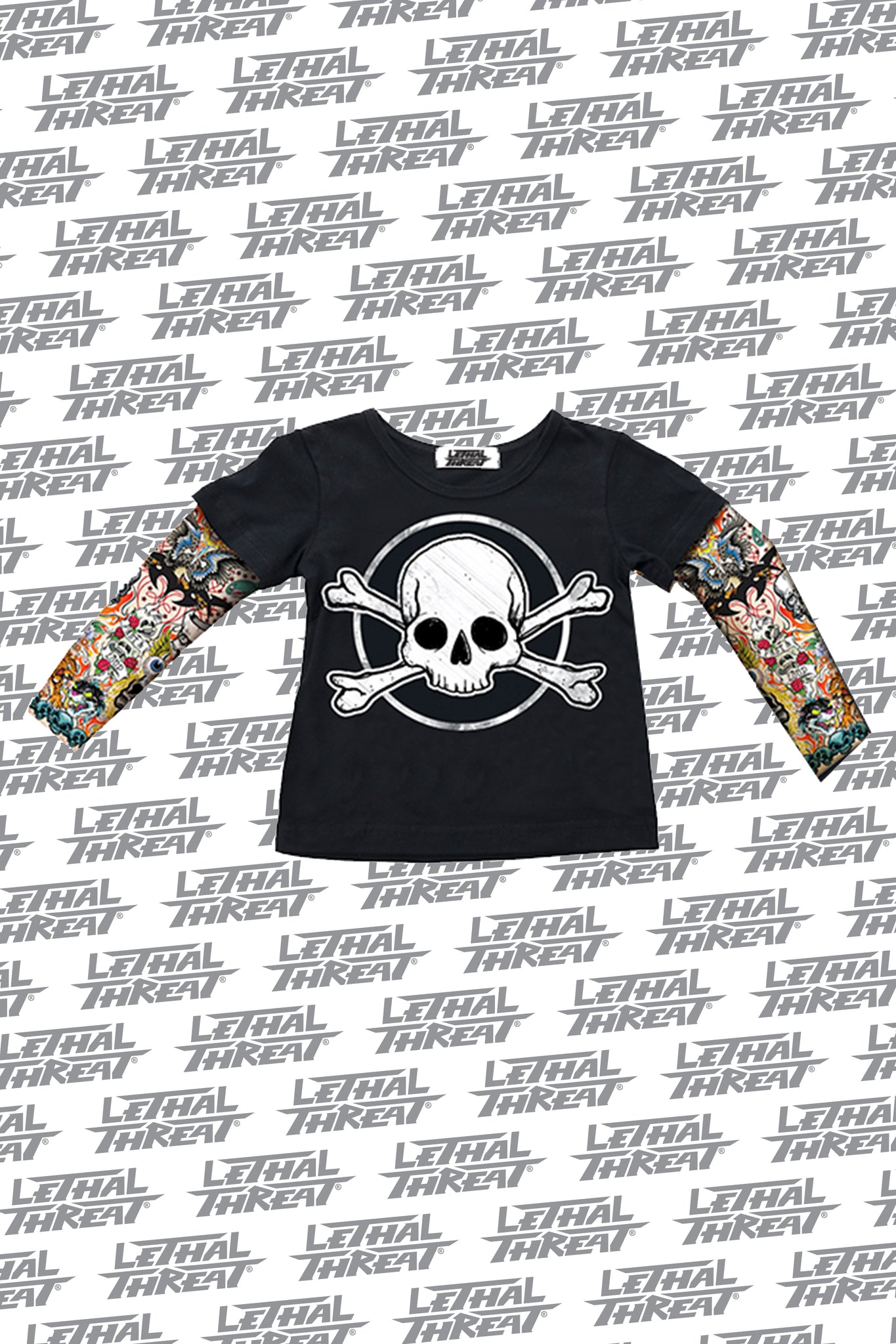 Little rebel at home? It's never too young to want tattoos, this shirt is perfect for the little rebels out there who want to stand out! Sleeves are are full color with designs boys love from panthers to cartoon skulls. Our two in one Shirt, with attached full color printed sleeves, is the next best thing to a real tattoo sleeve. Cool skull n bones chest print. This kid is going to rock the monkey bars in style!